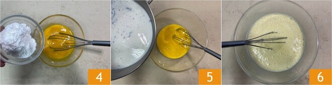 Ajoutez la fécule de maïs 4 et mélangez bien, à ce stade le lait sera chaud, retirez la gousse et versez dans le bol 5. Mélangez bien 6.