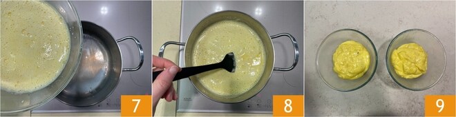 Remettez le mélange dans la casserole où vous avez chauffé le lait 7 et épaississez la crème en mélangeant continuellement 8. Dès qu'elle aura la bonne consistance, divisez la crème dans deux bols 9.