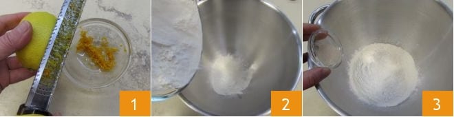 Pour réaliser les Zippulas ou zeppole sardes, commencez par la pâte : râpez le zeste de l'orange et du citron 1 non traités et réservez-le. Dans le bol d'un robot pâtissier (ou dans un bol en verre si vous procédez à la main), versez la farine tamisée 2 et ajoutez la levure de boulanger déshydratée 3.