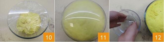 Couvrez le bol avec un film plastique 10 et laissez lever pendant environ 3 heures ou jusqu'à ce que la pâte ait doublé de volume 11. Le lieu idéal pour la levée est le four éteint avec la lumière allumée. Une fois le temps de levée écoulé, procédez à la friture : dans une casserole, chauffez l'huile de graines jusqu'à atteindre 170°C, pour surveiller la température utilisez un thermomètre de cuisine qui vous garantira une friture optimale. Pour former les zeppole, procédez comme suit : mouillez-vous les mains avec de l'eau 12
