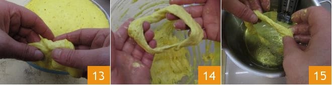 puis prenez un petit morceau de pâte 13 et formez un petit beignet avec un trou assez large 14, plongez-le dans l'huile chaude 15