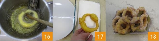 et en vous aidant avec le manche en bois d'une louche, faites tourner le petit beignet 16, de sorte qu'il conserve sa forme pendant la cuisson. Lorsque la zeppola est dorée, égouttez-la avec une écumoire et déposez-la sur un plateau recouvert de papier absorbant pour éliminer l'excès d'huile. Continuez à former d'autres zeppole jusqu'à épuisement de la pâte. Pour finir, passez les zeppole dans le sucre en poudre des deux côtés 17. Servez immédiatement vos zeppole sardes ! 18