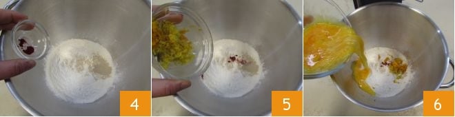 Ajoutez ensuite également le safran en poudre 4, le zeste de citron et d'orange râpé 5 et les œufs légèrement battus 6.