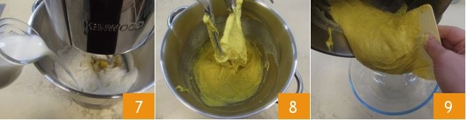 Mettez en marche le robot muni de la feuille et versez le lait en filet 7. Travaillez la pâte à vitesse moyenne pendant environ 5-6 min. La pâte sera très hydratée et collante 8. À ce stade, versez la pâte dans un bol, en vous aidant d'une spatule pour la détacher des parois 9.