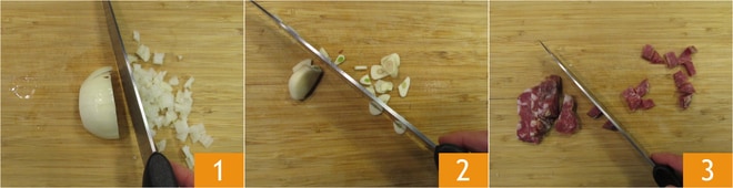 Pour préparer les ziti au four, épluchez et hachez l'oignon 1, faites de même avec les gousses d'ail 2 et coupez le salami en dés 3.