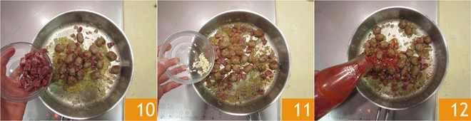 Ajoutez également le salami 10 et l'ail haché 11. Versez ensuite la sauce tomate 12, en la diluant avec un peu d'eau, juste assez pour rincer le pot. Poivrez et salez peu, car le salami apportera du sel à la sauce.