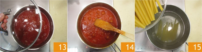 Couvrez avec le couvercle et laissez cuire la sauce environ 30 minutes 13. Une fois cuite, mettez de côté 14. Faites cuire les ziti cassés dans de l'eau bouillante salée, ils doivent être très al dente 15.