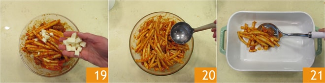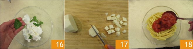 Mélangez la ricotta avec le basilic, du sel, du poivre et de l'huile 16. Coupez la provola et la mozzarella en dés 17. Égouttez les ziti dans un bol, en réservant l'eau de cuisson, versez la sauce 18.