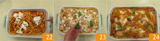 Rehaussez de parmesan et de quelques cuillerées de ricotta 22. Continuez avec d'autres pâtes, puis encore de la ricotta, du fromage râpé, de la mozzarella et des feuilles de basilic 23. Cuire au four statique préchauffé à 180° pendant 20 minutes ou jusqu'à coloration dorée. Laissez reposer 15-20 minutes avant de servir les ziti au four 24.