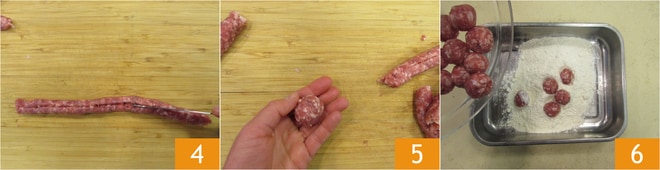 Incisez la saucisse 4, retirez la peau et formez de petites boulettes avec la viande 5. Passez les boulettes dans la farine 6.