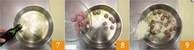 Chauffez une généreuse quantité d'huile dans une poêle 7 et faites dorer les boulettes 8, puis ajoutez l'oignon 9.