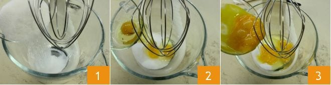 Pour préparer le zuccotto au raisin fraise, commencez par le biscuit au cacao (vous pouvez consulter la procédure ici : Génoise au cacao). Versez le sucre dans le bol d'un robot pâtissier (si vous n'en avez pas, vous pouvez utiliser un grand bol et un batteur électrique) 1, ajoutez les œufs entiers 2 et les 8 jaunes 3.