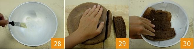 Passez ensuite à beurrer un moule à zuccotto d'un diamètre de 21,5 cm 28 et chemisez-le de papier sulfurisé. Coupez le biscuit en tranches d'environ 1 cm 29 et tapissez le moule 30.
