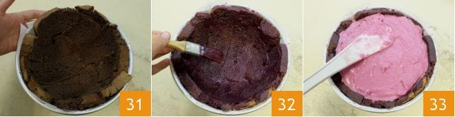 Maintenant que vous avez chemisé le zuccotto 31, prenez le sirop de raisin fraise et badigeonnez soigneusement le biscuit 32. Sortez ensuite la glace du congélateur, versez-la dans le zuccotto et nivelez avec une spatule 33.