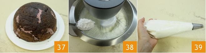 Retournez délicatement le zuccotto sur une assiette de service 37. Enfin, montez la crème qui servira à décorer le zuccotto. Dans un robot pâtissier (ou dans un bol avec un batteur électrique), versez la crème fraîche, actionnez les fouets et ajoutez le sucre glace 38. Lorsque la crème est bien montée, transférez le mélange dans une poche à douille avec une pointe étoile 39. Pour monter la crème, vous pouvez voir la procédure en détail ici : comment monter la crème.