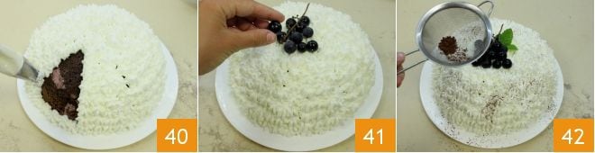 Commencez à décorer le zuccotto au raisin fraise en recouvrant toute la surface de touffes de crème 40. Terminez ensuite avec une grappe de raisin fraise 41 et, si vous le souhaitez, avec des feuilles de menthe et une pincée de cacao amer 42. Conservez votre zuccotto au raisin fraise au congélateur et sortez-le environ 15 minutes avant de le servir !