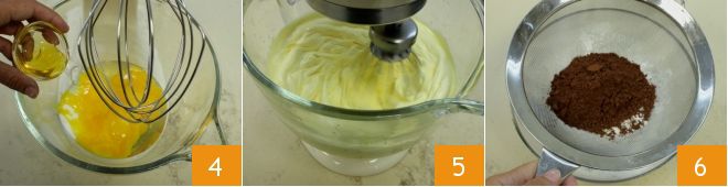 Puis versez le miel 4, actionnez les fouets et battez les ingrédients pendant environ 15 minutes jusqu'à obtenir un mélange gonflé et homogène 5. Dans un petit bol à part, tamisez ensemble la fécule (ou la maïzena), la farine et le cacao 6.