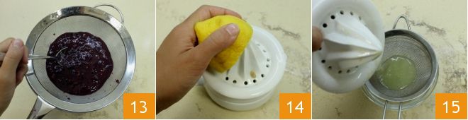 Passez le jus à travers un tamis pour éliminer les pépins et les peaux 13. Pressez ensuite le jus d'un citron 14 et filtrez-le également avec un tamis à mailles fines 15.