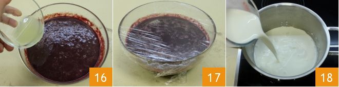 Versez ensuite le jus de citron filtré dans le bol avec le jus de raisin fraise 16 et couvrez de film plastique 17. Placez le bol au réfrigérateur, tandis que vous continuez avec le reste de la préparation. Prenez une petite casserole, versez la crème liquide fraîche 18.