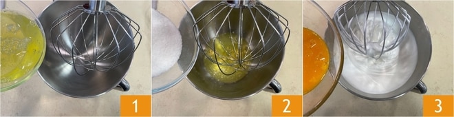 Pour préparer le zuccotto forêt-noire, commencez par la pâte biscuit au cacao : dans un batteur muni d'un fouet, montez les blancs d'œufs 1 avec le sucre 2 jusqu'à obtenir une consistance crémeuse et brillante. Battez les jaunes avec une fourchette et incorporez-les au mélange avec une spatule 3.