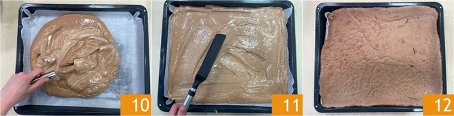 Versez la pâte dans un moule d'environ 45x37 cm, huilé et dont le fond est recouvert de papier sulfurisé 10, nivelez bien avec la spatule 11 et faites cuire dans un four statique préchauffé à 190°C pendant environ 15-20 minutes sur la grille du milieu. Sortez la pâte biscuit du four 12.