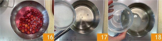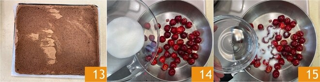 Retournez immédiatement le gâteau encore chaud 13, puis couvrez toute la surface avec du film alimentaire au contact et laissez refroidir. Dénoyautez les cerises et faites-les cuire à la poêle avec le sucre 14 et la liqueur 15.