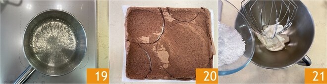 Laissez refroidir complètement le sirop 19. Une fois la pâte biscuit refroidie, à l'aide d'une roulette, découpez un disque de 25 cm, un de 15 cm et, avec les chutes, découpez également un disque d'environ 20 cm qui servira de base 20. Occupez-vous de la garniture : dans le batteur muni d'un fouet, versez le mascarpone et le sucre glace 21.
