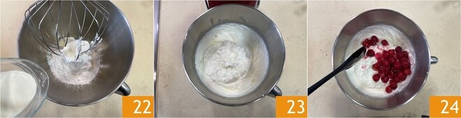Versez la crème fraîche 22 et montez la crème jusqu'à ce qu'elle soit mousseuse et homogène 23. Prélevez 500 g du mélange et ajoutez-y les cerises cuites 24; conservez au réfrigérateur le reste du mélange qui servira à décorer.