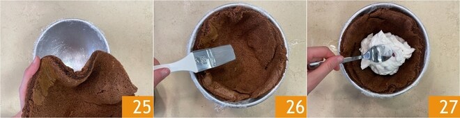 Tapisser de film alimentaire un moule à zuccotto d'environ 10 cm de hauteur et d'un diamètre de base d'environ 20 cm. Placez à l'intérieur le plus grand disque de pâte biscuit 25 et imbibez-le avec le sirop 26. Versez la moitié de la garniture à l'intérieur du moule 27.