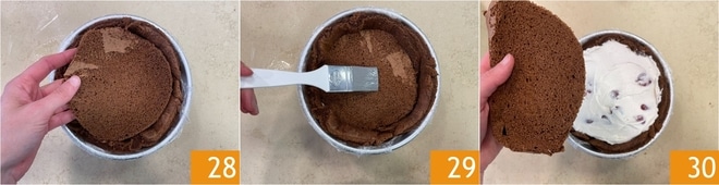 Ensuite, posez le plus petit disque de pâte biscuit 28 et imbibez-le des deux côtés 29. Ajoutez le reste de la garniture, puis fermez avec le disque intermédiaire découpé dans les chutes 30.