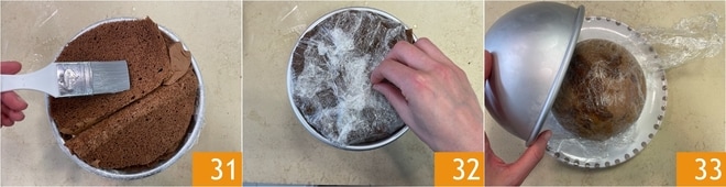 Imbibez légèrement et refermez la surface avec du film alimentaire au contact 32. Placez au réfrigérateur pendant au moins 3 heures. Une fois le temps de repos écoulé, démoulez le zuccotto sur un plat de service 33.