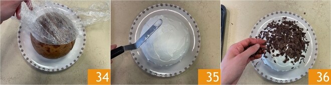 Retirez le film 34 et recouvrez toute la surface d'une fine couche du mélange restant à base de crème et mascarpone 35. À l'aide d'un éplucheur, réalisez des copeaux de chocolat et faites-les adhérer à la surface du zuccotto 36.