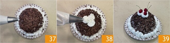 Enfin, avec une poche à douille, créez une bordure à la base 37 et des touffes décoratives en surface 38, en terminant par trois cerises placées au centre 39. Laissez refroidir au réfrigérateur pendant au moins une heure avant de servir votre zuccotto forêt-noire.