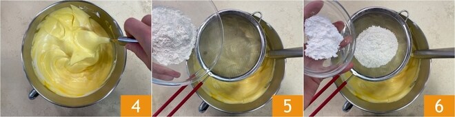 Mélangez délicatement 4, puis tamisez la farine 00 5 et la levure 6 dans la pâte.