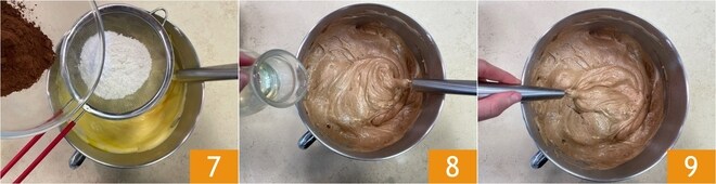 Incorporez également le cacao tamisé 7 et enfin, versez l'huile 8, en mélangeant toujours avec une spatule 9.