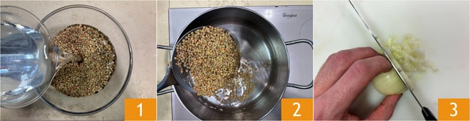 Pour préparer la soupe d'épeautre et de lentilles, commencez par faire tremper les lentilles dans de l'eau froide 1 pendant 2 heures. Égouttez-les, mettez-les dans une casserole avec de l'eau froide salée 2 et faites cuire pendant 30 minutes. Égouttez-les à nouveau et réservez à la fois les lentilles et l'eau de cuisson. Coupez finement l'oignon 3.