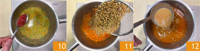 Ajoutez le concentré de tomate 10 et les lentilles 11. Couvrez avec l'eau de cuisson des lentilles 12.