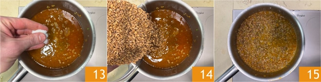 Ajustez le sel 13. Ajoutez aussi l'épeautre 14 et faites cuire pendant 30 minutes 15. Si nécessaire, ajoutez plus d'eau de cuisson des lentilles.