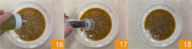 Servez et complétez avec un filet d'huile 16 et une pincée de poivre 17. La soupe d'épeautre et de lentilles est prête à être savourée 18