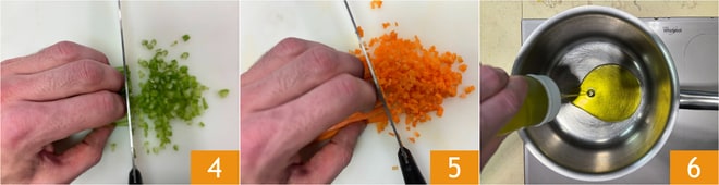 Faites de même pour le céleri 4 et la carotte 5. Dans la même casserole où vous avez cuit les lentilles, versez l'huile 6.