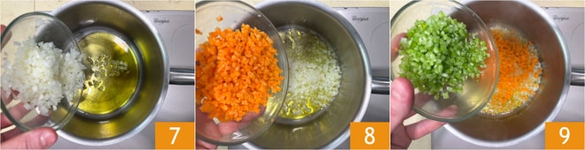 Ajoutez l'oignon 7, la carotte 8 et le céleri 9. Faites revenir pendant quelques minutes.