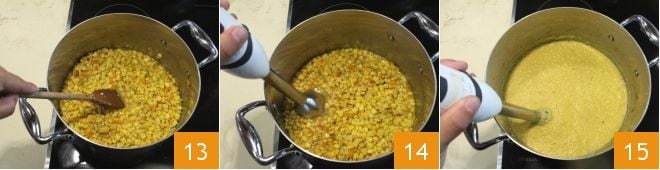 Remuez de temps en temps et lorsque le mélange se sera ramolli et aura absorbé une partie du bouillon 13, introduisez le mixeur plongeant dans la casserole 14 et mixez jusqu'à obtenir un mélange dense et homogène 15, en ajoutant du bouillon si nécessaire. Laissez cuire pendant environ 5 minutes et enfin, éteignez le feu.