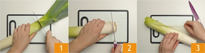 Pour préparer la soupe aux poireaux, commencez par enlever la partie verte du poireau 1, coupez les racines 2 et retirez les feuilles les plus extérieures 3.