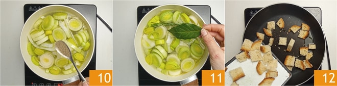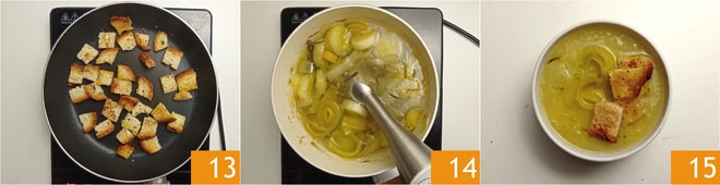 Faites cuire à feu moyen pendant 2 minutes 13, en remuant souvent pour éviter qu'ils ne brûlent. Quelques minutes avant la fin de la cuisson, mixez avec un mixeur plongeant 14 environ la moitié des ingrédients pour obtenir une soupe encore plus consistante. Servez la soupe en la complétant avec le pain grillé. Votre soupe aux poireaux est prête à être servie 15.