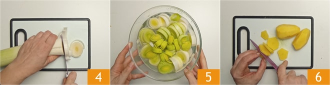 Coupez-le en rondelles d'environ 1 cm d'épaisseur 4. Rassemblez le tout dans un bol et couvrez d'eau froide 5. Laissez reposer jusqu'au moment de l'utilisation. Pendant ce temps, pelez et coupez les pommes de terre en tranches d'environ 1 cm d'épaisseur 6.