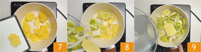 Dans une poêle, chauffez l'huile, ajoutez les pommes de terre 7 et faites-les dorer pendant 2 minutes. Égouttez les poireaux, ajoutez-les dans la poêle 8, mélangez et continuez la cuisson pendant 2 minutes supplémentaires. Versez de l'eau jusqu'à couvrir les ingrédients 9.