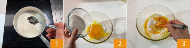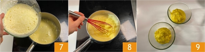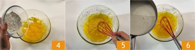 Ajoutez maintenant également la fécule de maïs 4 et mélangez encore 5. Dès que le lait a atteint l'ébullition, ajoutez-le lentement au mélange d'œufs, en remuant pour le tempérer 6.