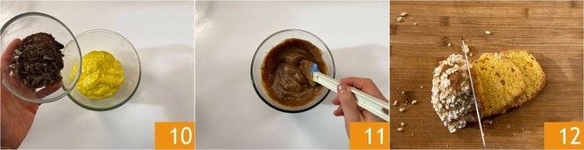 Dans l'autre bol, versez le chocolat râpé 10 et mélangez jusqu'à ce qu'il soit complètement fondu 11, puis laissez refroidir. À ce stade, coupez la colombe en tranches d'une épaisseur de 1 cm 12.