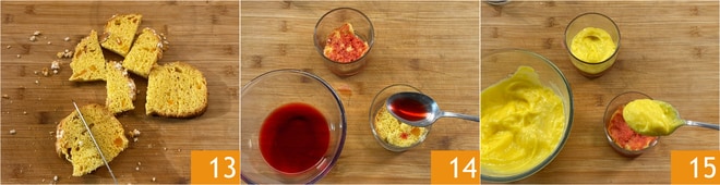 Ensuite, coupez les tranches en morceaux 13. Prenez 4 verrines d'une capacité de 200 ml et tapissez le fond avec les morceaux de colombe, en les aplatissant légèrement avec les mains. Imbibez la colombe avec de l'alchermes 14 et recouvrez d'une couche de crème pâtissière classique 15.