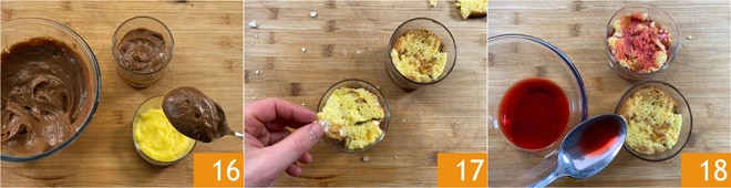 Ajoutez une couche de crème au chocolat 16 et une autre de colombe 17, puis imbibez à nouveau avec de l'alchermes 18.
